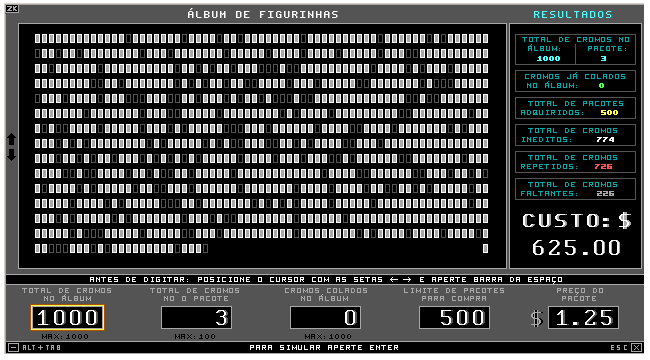 2 - Quanto às funcionalidades do simulador Álbum de figurinhas, ele opera de acordo com os seguintes princípios: a) O computador, após "comprar" um pacote; abre o pacote e, em seguida, cola as figurinhas no álbum. E continua a fazer isso, até que o álbum fique completo; b) Não existem figurinhas repetidas em um mesmo pacote. |