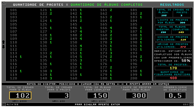 2 - Quanto às funcionalidades do simulador Álbum de figurinhas, ele opera de acordo com os seguintes princípios: a) O computador, após "comprar" um pacote; abre o pacote e, em seguida, cola as figurinhas no álbum. E continua a fazer isso, até que o álbum fique completo; b) Não existem figurinhas repetidas em um mesmo pacote. |